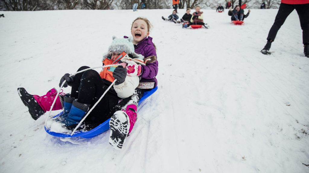 - zjeżdżaj zawsze w bezpiecznej pozycji – siedząc na sankach lub stabilnie stojąc na nartach,