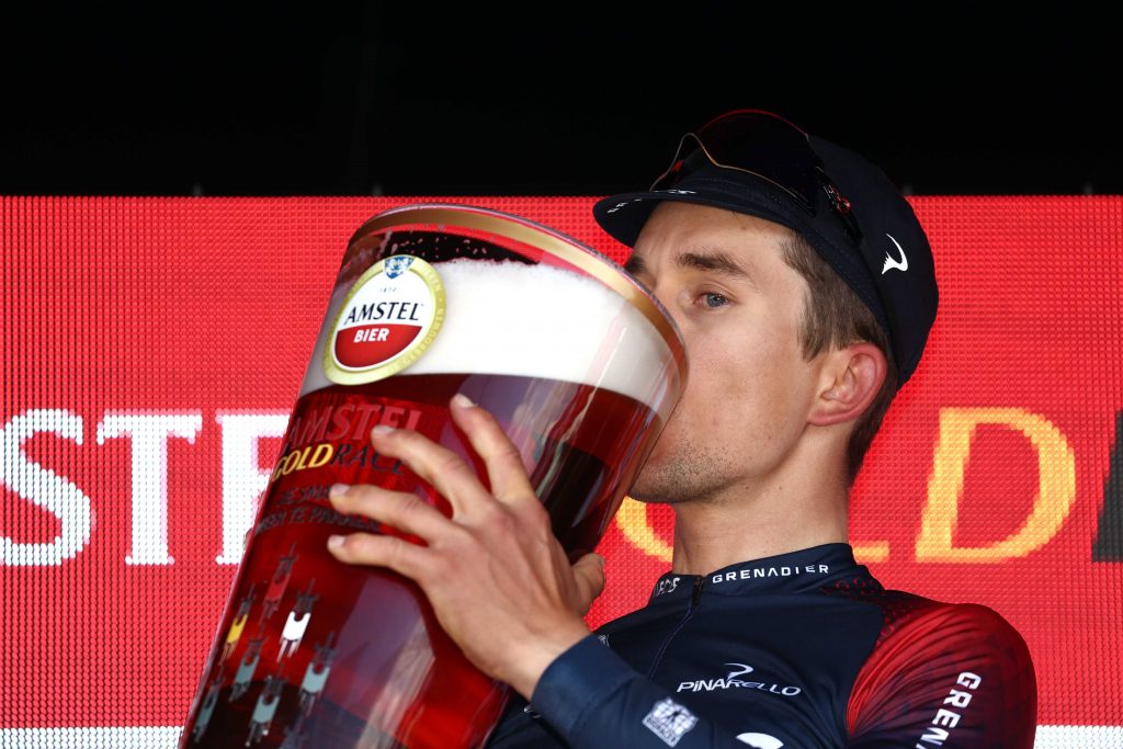 Michał Kwiatkowski na podium Amstel Gold Race w Valkenburgu, w Holandii.
