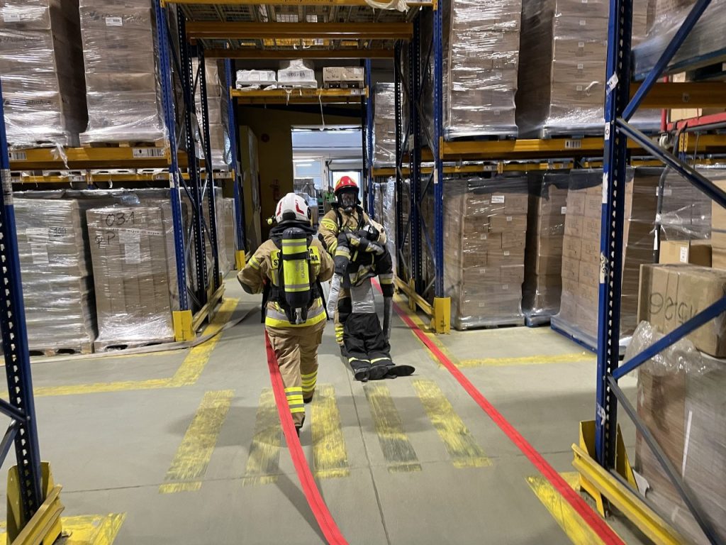 Scenariusz zakładał pożar stacji ładowania akumulatorów w zakładzie produkcyjnym. Zadaniem strażaków było nie tylko opanowanie ognia, lecz także zapewnienie bezpieczeństwa pracownikom i ochrona materiałów o wysokiej gęstości obciążenia ogniowego.