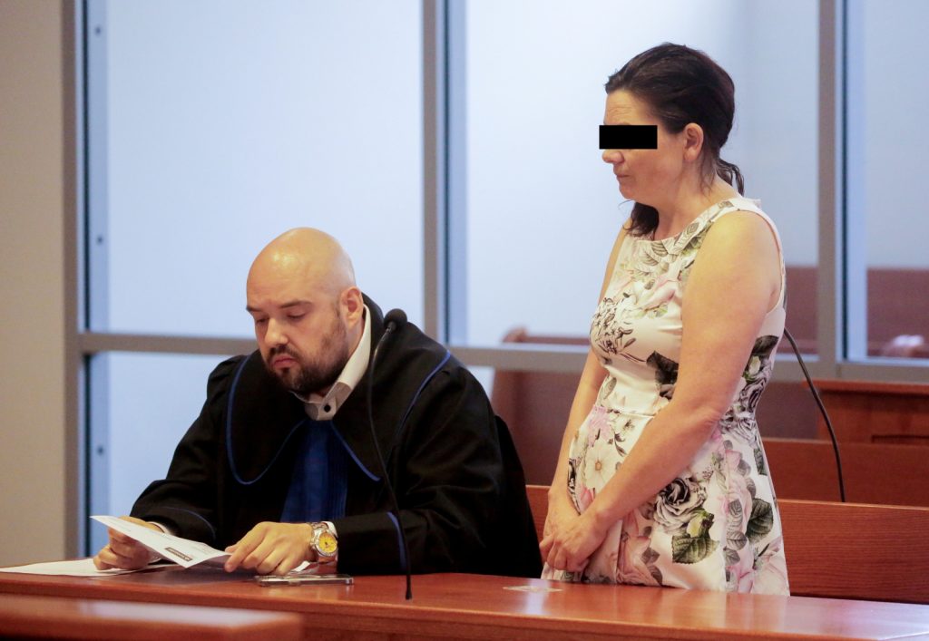 Oskarżona Kamila M. i radca prawny Jakub Pikała na sali Sądu Okręgowego w Olsztynie.