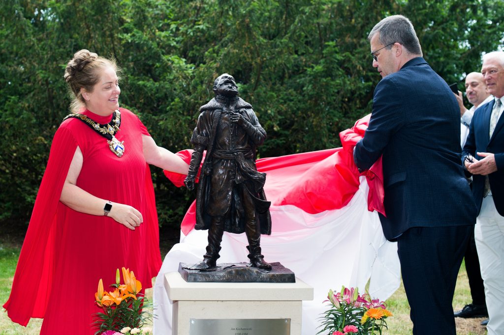 Burmistrz miasta, Gill Cleeve (z lewej) i ambasador RP w Wielkiej Brytanii, Piotr Wilczek odsłaniają pomnik Jana Kochanowskiego.