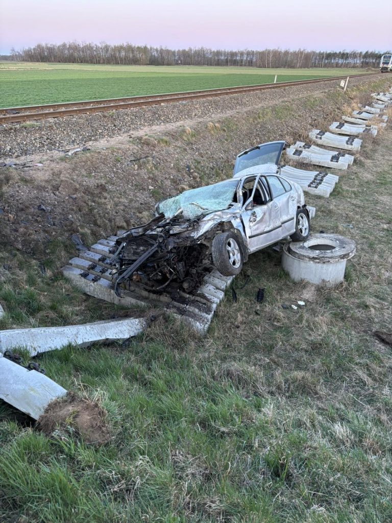 W wyniku silnego uderzenia samochód wypadł z drogi i zsunął się pod nasyp kolejowy. Pojazd został całkowicie zniszczony.