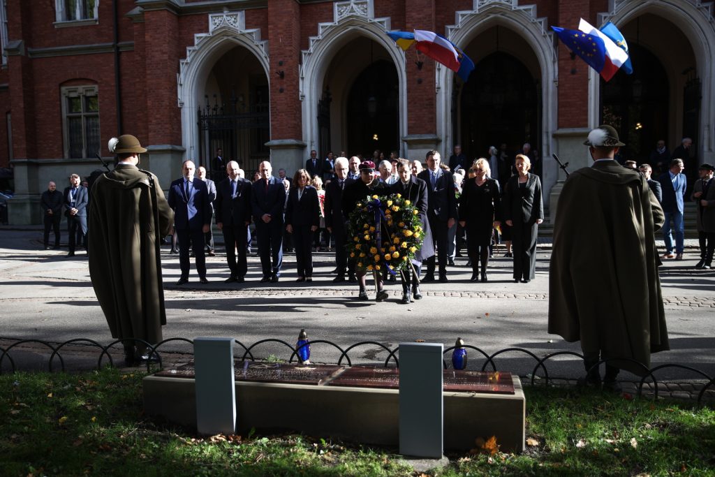 Obchody Akademickiego Dnia Pamięci w rocznicę Sonderaktion Krakau przed tablicami pamiątkowymi w Collegium Novum UJ w Krakowie.