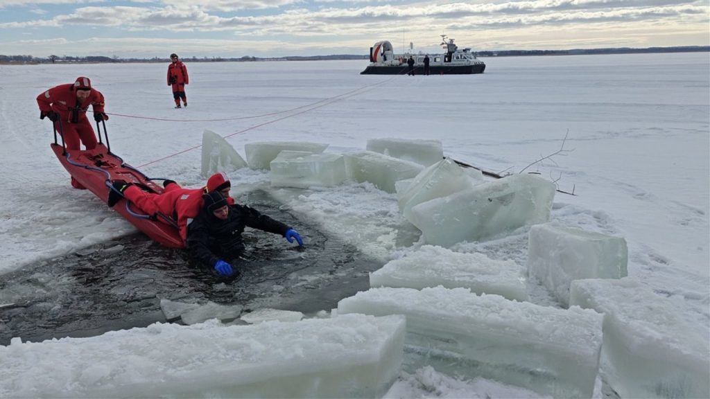 Pokrywa lodowa na Zalewie Wiślanym zaczyna się topić, ale służby wykorzystują te warunki do przeprowadzania ekstremalnych ćwiczeń. Na zamarzniętym akwenie działał poduszkowiec Straży Granicznej, a funkcjonariusze doskonalili procedury ratownictwa osób zagrożonych załamaniem lodu.
