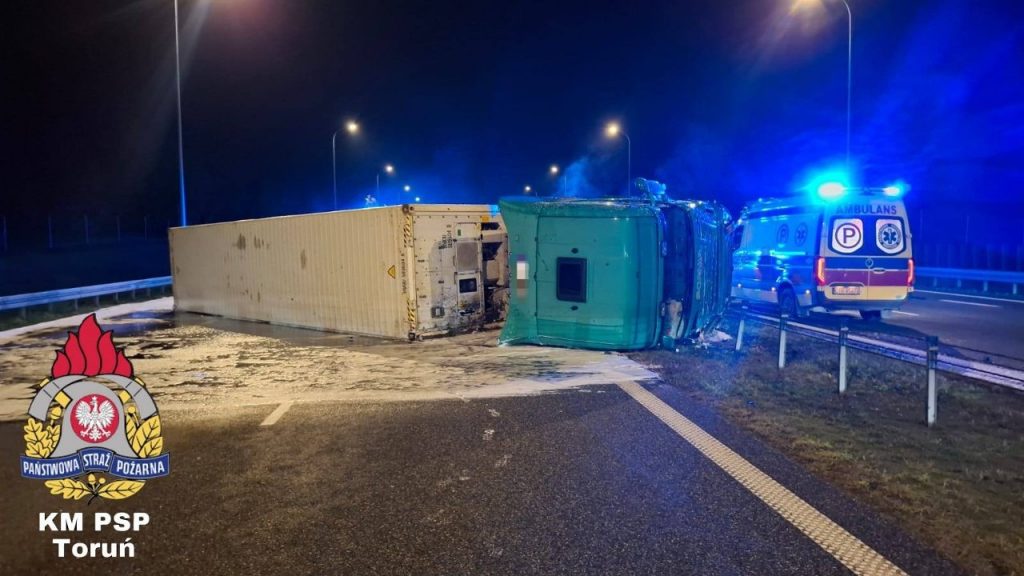 Tragiczny wieczór na drogach regionu. Nie żyje pieszy potrącony na DK15, a na autostradzie A1 przewróciła się ciężarówka