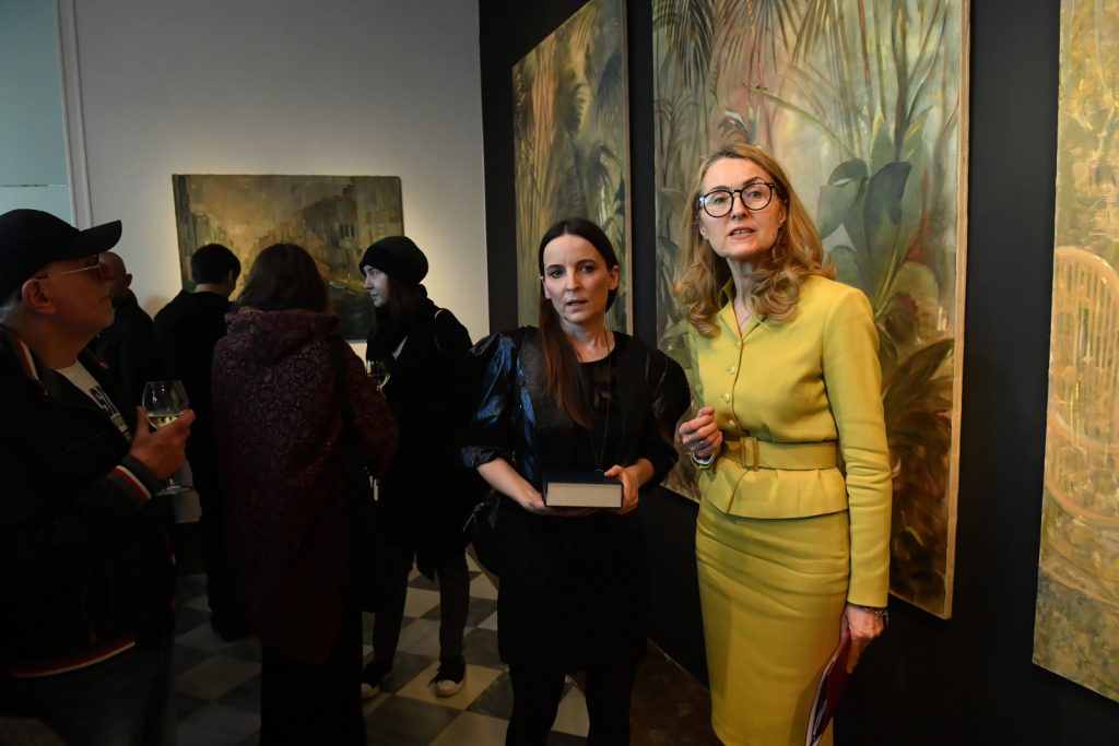 Rzecznik prasowy galerii Joanna Bancerowska (z prawej) oraz córka artysty Dorota Ałaszewska podczas otwarcia wystawy pt. “Marek Ałaszewski. Malarstwo” w Kordegardzie Galerii Narodowego Centrum Kultury w Warszawie.