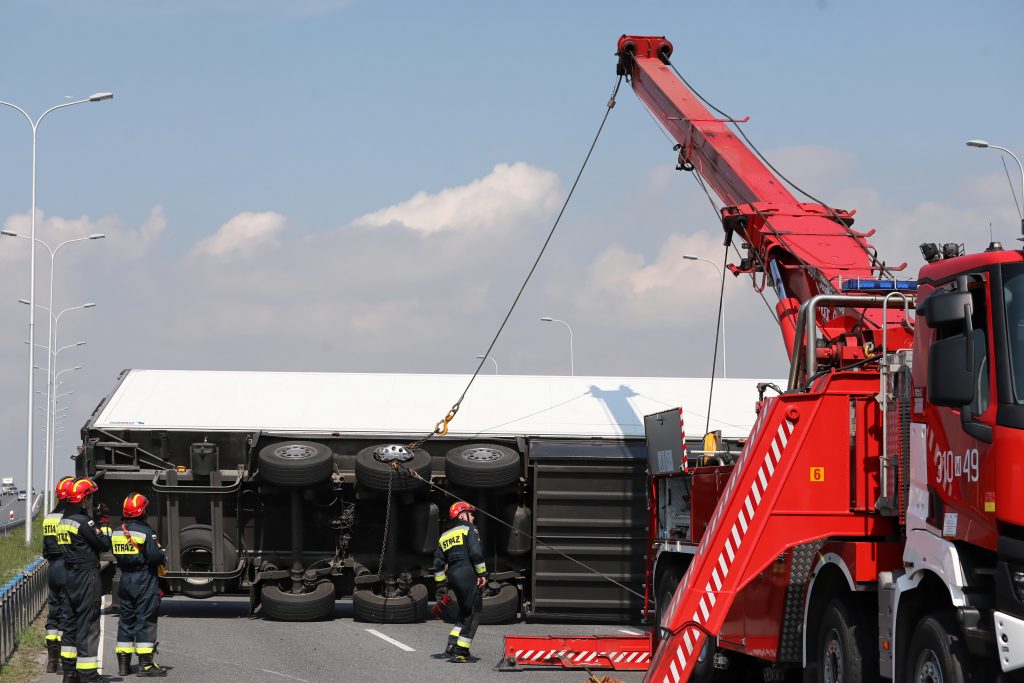 Na trasie szybkiego ruchu S2 na Południowej Obwodnicy Warszawy, pomiędzy węzłami Lotnisko i Opacz, przewrócił się samochód ciężarowy.